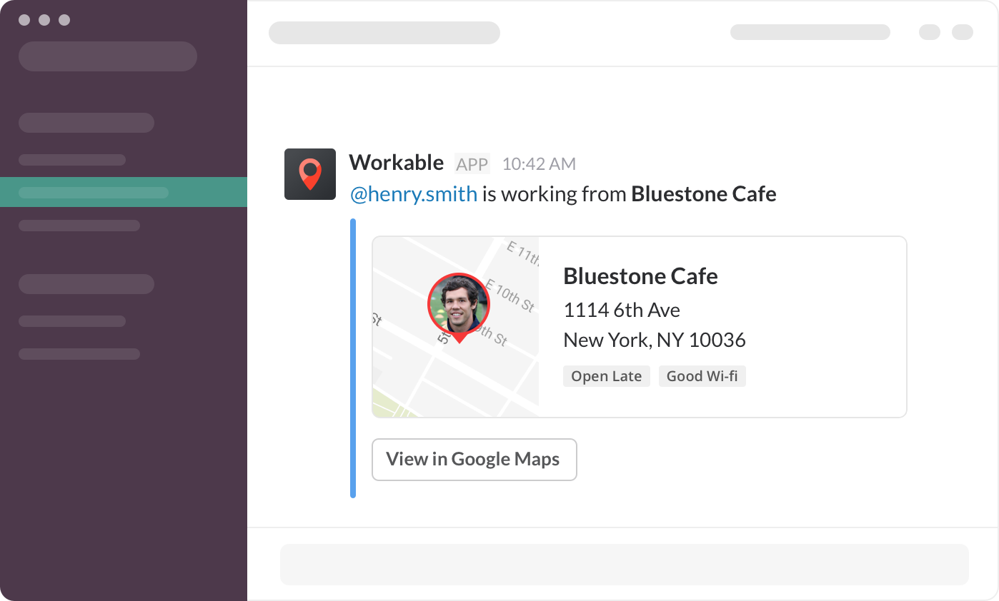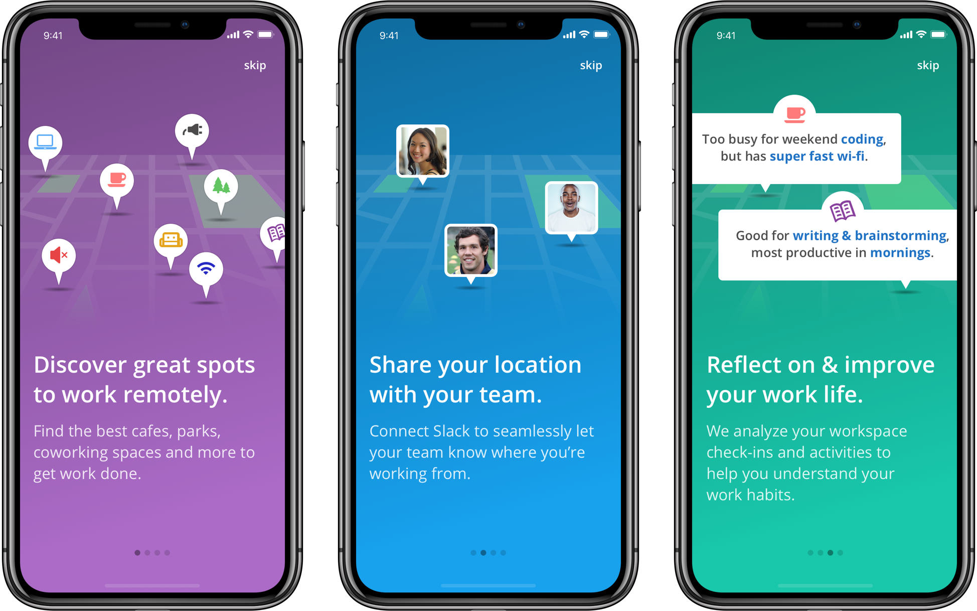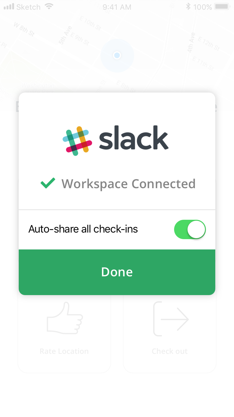Slack integration - Users have the option of connecting their team Slack accounts. This allows them to automatically trigger status updates with details of their current work location.