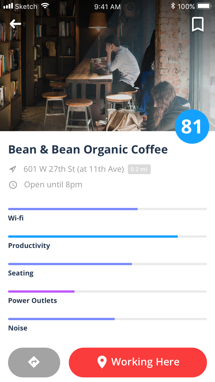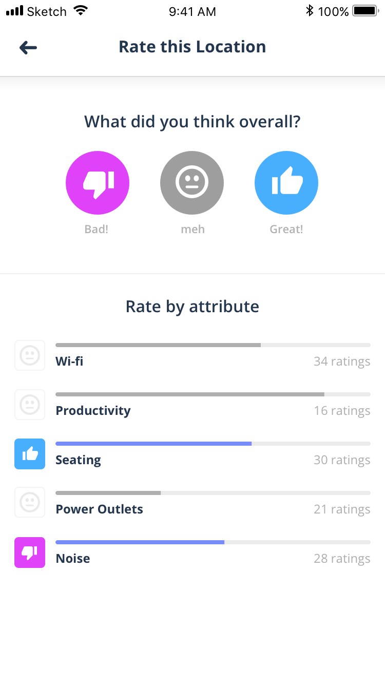 Workspace rating - If Workable has confirmed a user has visited a workspace, they have the option of providing feedback about it. Ratings are broken down by attributes and a user's response teaches Workable about each workspace, as well as the user's preferences.