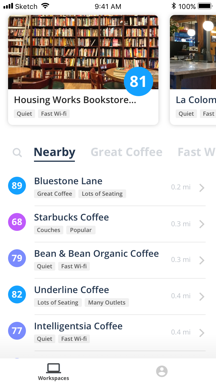 With many workers preferring a remote office, their definition of a workspace becomes much more broad. All types of shops, venues, restaurants and hidden nooks can serve as a suitable place to get through your daily tasks. Traditional search services are not hyper-focused on this use case. So an organized, ranked and searchable database of ideal workspaces becomes a handy tool. Workable informs the user of which workspaces might be best for which purposes. Whether it's planning out extended blocks of time or spur-of-the-moment meetups with colleagues.